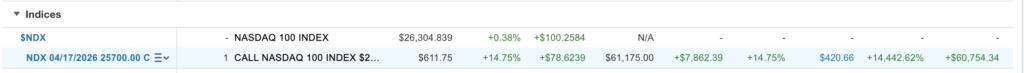 On the one call that is $420 to $61,175. A 150x return. On a pure percentage basis, this one is even bigger than my NVIDIA trade a couple years ago. Wish I had bought 30 contracts instead of 3.